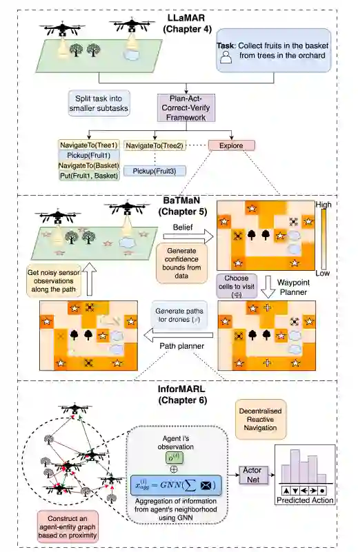 自主多智能体系统必须在动态和未知环境中高效规划、探索与导航,尤其在搜索救援和环境监测等任务中。这些场景通常具有部分可观测性、通信受限和动态目标等特点,需要智能体之间进行灵活的协调。设计能够随团队规模和任务复杂性扩展的自主性,需要能够进行高层推理、信息驱动探索和稳健去中心化执行的模块化决策系统。本论文提出了一个分层决策框架,旨在从三个互补的自主层级应对这些挑战:高层规划、自适应探索和去中心化可扩展导航。在最高层级,LLaMAR(基于语言模型的多智能体机器人长时程规划器)利用大语言模型(LLMs)将长时程任务分解为结构化的子任务,使智能体能够动态调整策略。然而,这些计划的有效执行需要环境知识。我们中层的探索策略,BaTMaN(基于赌博机的追踪监测与导航),系统性地优先考虑能最大化信息增益的路径点,同时平衡能源效率和传感器可靠性等现实约束。最后,InforMARL(信息驱动的多智能体强化学习导航)通过基于图的局部信息聚合,提供了可扩展的去中心化导航,提高了采样效率,并展示了对未见过的团队规模的迁移能力。