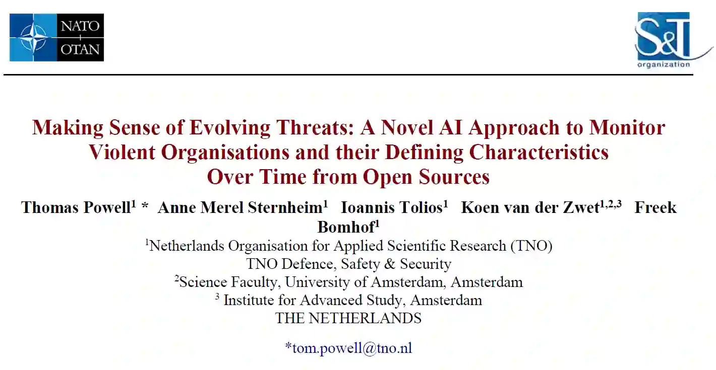 当今日益不稳定的地缘政治环境为暴力组织的发展提供了机会--无论是恐怖分子、犯罪分子、叛乱分子还是好战分子。因此,对北约及其国家来说,监测和了解潜在的威胁性组织是非常重要的,因为它们在不断发展。同时,数字化导致了开源信息量的爆炸性增长,带来了分析机会,但也带来了信息过载的挑战,而人工智能(AI)的发展为应对这一挑战提供了新的技术。在本文中,我们以组织理论和人工智能的知识为基础,提出了一个从大量开放源中自动提取威胁性组织信息的方法的第一步。具体来说,我们使用一个现有的暴力组织数据库作为起点,并结合三种不同的人工智能方法来提取几个特定的组织特征。(1) 监督机器学习(ML)用于提取活动类型和目标类型;(2) 无监督ML用于提取意识形态;以及(3) 自然语言处理(NLP)用于提取组织规模、领导人数量以及攻击中的死伤人数。我们评估了这些方法的性能,并对它们的普遍性进行了思考。通过这样做,我们向自动监测威胁性组织及其演变过程中的定义特征的工具迈出了一步。我们讨论了未来的步骤,例如实施模型来"填补"缺失或不完整的信息,以及在新的威胁性组织出现时自动检测它们。