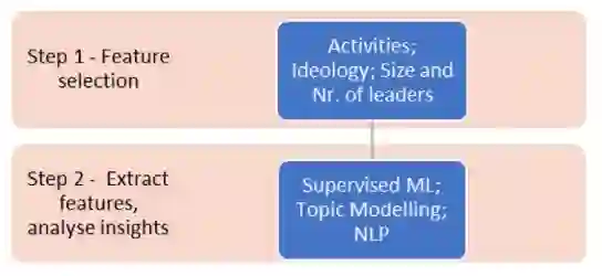 在本文中,我们旨在解决这一挑战,同时借鉴现有的工作,将数据驱动(数据科学和人工智能)和分析师驱动(定性、理论驱动)的见解结合起来(Pherson & Pherson, 2020;Westerveld, Powell & Eles, 2020)。其结果是图示的方法,它使用了人工智能(AI)技术的组合,从公开来源中提取关于暴力组织在一段时间内的定义性特征的信息。通过这样做,我们希望支持分析师处理信息过载的问题,并向为国防从业人员提供决策支持工具迈出一步,以了解不断变化的威胁。具体来说,我们以组织理论、情报分析和人工智能方面的文献为基础并加以扩展,以解决以下研究问题:
