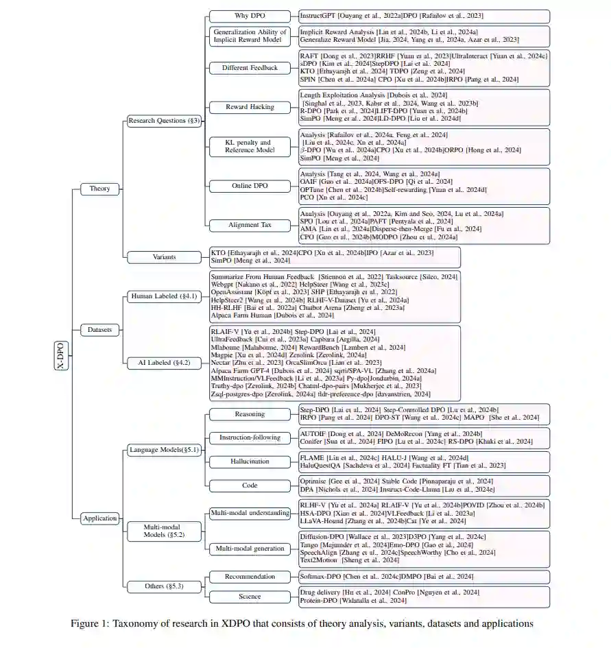 我们希望这篇综述能够帮助研究人员抓住该领域中的新趋势和挑战,探索DPO在对齐LLMs和多模态LLMs(MLLMs)中的潜力,并为构建更具可扩展性和普适性的DPO做出贡献。具体而言,我们认为未来的研究应优先开发更先进的DPO变体,这些变体能够:(i)超越实例级反馈,捕捉更细粒度和准确的奖励;(ii)通过数据、学习目标和奖励展示出与在线RLHF相比具有竞争力或更强的泛化能力;并且(iii)促进复杂应用的发展,如深度推理系统(例如OpenAI o1 [OpenAI, 2024b])、混合模态模型(例如Chameleon [Team, 2024])。 本文其余部分的组织结构如下。(§ 2)介绍了RLHF和DPO的背景知识。(§ 3)介绍了DPO的研究问题和不同变体。DPO使用的数据集和应用分别在(§ 4)和(§ 5)中介绍。(§ 6)讨论了DPO的机遇和挑战。最后在(§ 7)中给出了简短的结论。