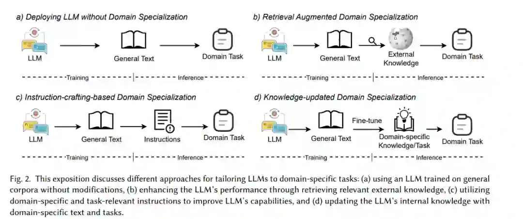 大型语言模型(LLMs)作为通用任务解决器的巨大前景激励人们将其功能大幅度扩展,远超过仅作为“聊天机器人”[173],而是将其用作特定领域如健康保健、金融和教育的助手,甚至替代人工或现有的事实上的工具。然而,直接应用LLMs进行领域特定的问题解决会遇到许多难题。首先,不同领域、角色和任务的对话和语言风格存在显著差异,范围从医疗处方,到法律句子,到在线聊天等。获取这些能力和经验甚至需要人类进行多年的训练,其中很多都是实践性的和专有的。此外,不同的领域、机构和团队有自己的“商业模式”,关于哪种回应将最大化他们自己的效用函数以完成他们的任务,这是不能直接被一个没有定制的通用LLMs解决器所替代的。更重要的是,专业级使用的领域知识要求也需要非常深入,实时且准确,这些都不是预训练的LLMs能轻易达到的。许多领域知识资源是机构的专有资产和核心竞争力,绝不能泄露给通用的LLMs。最后但并非最不重要的一点,语言受到社会规范、文化一致性、宗教信仰、法律要求和道德实践的约束,所有这些在不同的地方、国家、人口、种族、社区等都是变化的参数,这使得通用的LLMs不可能成为一个无需任何定制的一体适应所有的解决器。所有上述的难题都导致了“将LLMs专业化到领域”或“LLMs的领域专业化”的必要性,即将通用的LLMs定制到领域的上下文数据,增强领域知识,优化领域目标,并受到领域限制的调控。为了实现这个目标,这个主题目前正在经历极其快速的增长。