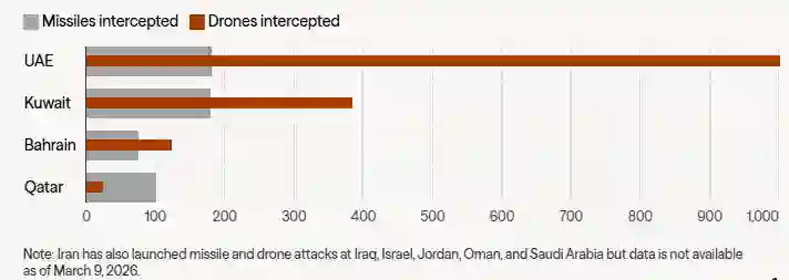 图:伊朗将大规模使用无人机。截至3月5日伊朗发射的遭拦截导弹与无人机数量