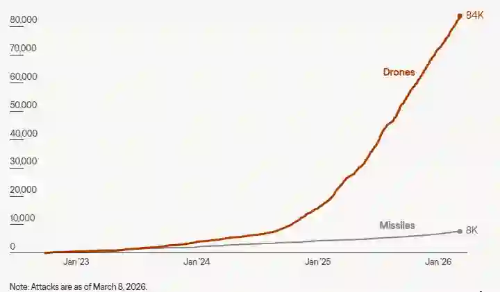 图:俄乌冲突期间俄罗斯无人机使用量急剧增加,自2022年9月以来累计发动的俄罗斯袭击次数