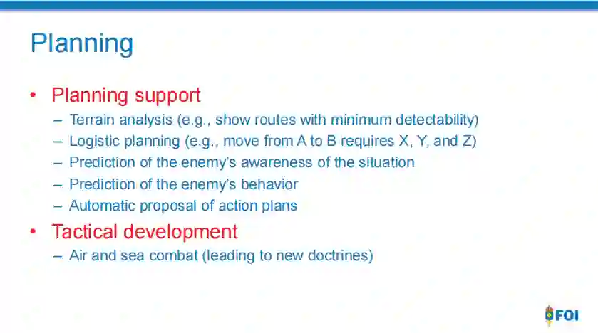 人工智能在军事中可用于多项任务,例如目标识别、大数据处理、作战系统、网络安全、后勤运输、战争医疗、威胁和安全监测以及战斗模拟和训练。