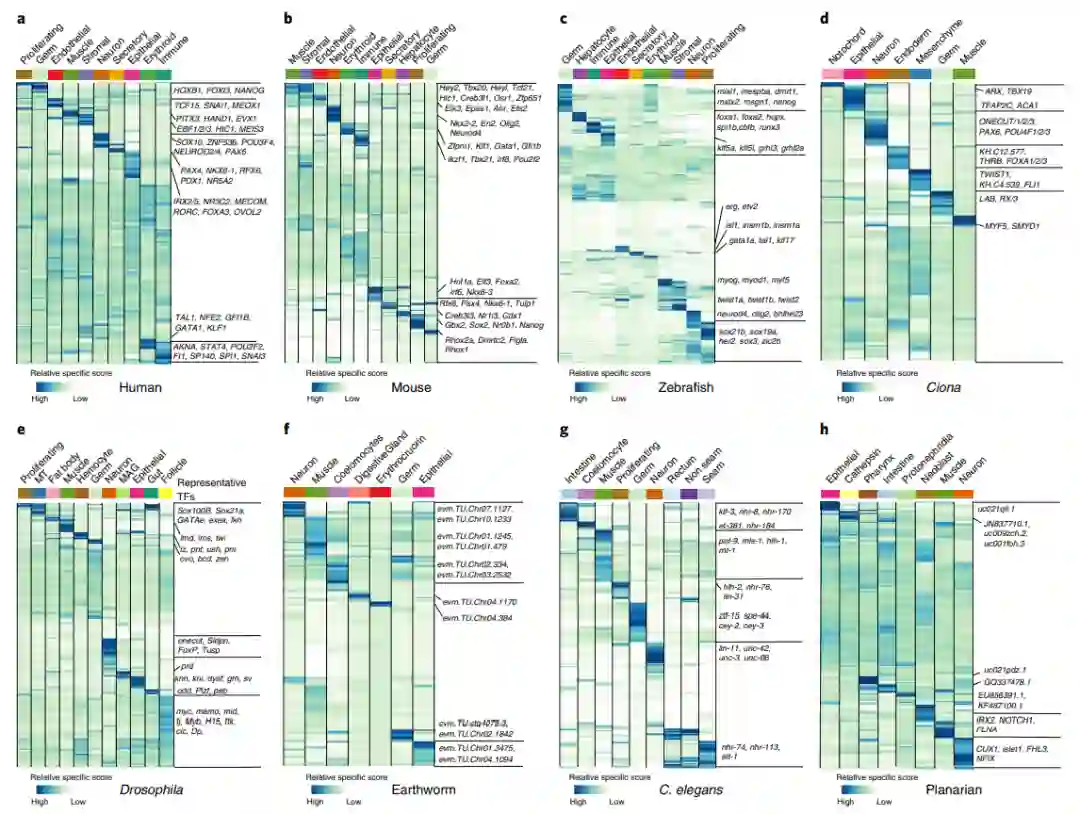 为了评估脊椎动物和无脊椎动物在调控水平上的调控保守性和细胞类型差异,作者计算了每个物种的TF特异性得分(图3a-h)。总的来说,作者在八个物种中共鉴定出2342个细胞谱系特异性TF。基于八个物种间同源基因的转换,可以观察到同源TF中更多保守特征。同源TF分别覆盖了人类、小鼠和斑马鱼所有细胞类型特异性TF的91.42%(70个中的64个)、98.75%(80个中的79个)和75%(104个中的78个)。总之,作者的研究为保守遗传调控基因的跨物种筛选提供了保守遗传调控的详细信息。