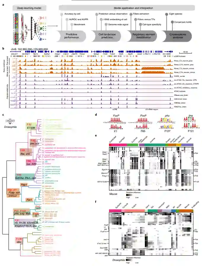 虽然TF的表达可以用scRNA-seq来测量,但目前尚不清楚基因组是如何在细胞图谱背后编码不同的时空遗传程序的。深度神经网络是建模高维数据中复杂关系的强大方法,有助于学习在特定条件下从基因组序列到基因表达的映射。目前已经开发了几种模型来预测DNA序列中的基因表达或染色质谱,如Xpresso、DeepSEA、Basset、 Enformer和AI-TAC。这些深度学习模型在识别复杂序列模式方面显示出了强大的能力。然而,此类模型尚未应用于多物种的综合图谱,并且细胞图谱水平的深度神经网络有可能识别出跨生物共享的新细胞类型特异性调控。