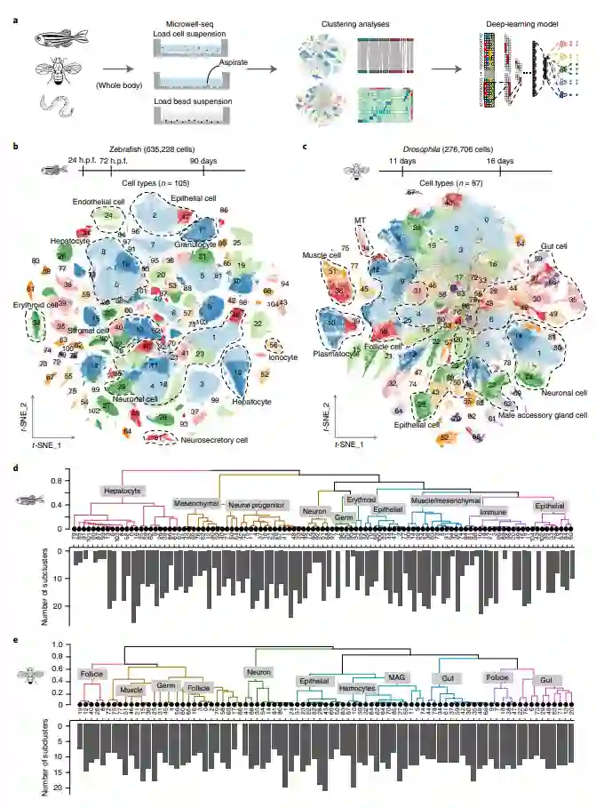 构建斑马鱼、果蝇和蚯蚓的单细胞图谱 之前,作者使用Microwell-seq构建了人类和小鼠的全生物体细胞图谱。在这项研究中,作者使用可以消除组织特异性批次效应的scRNA-seq策略构建了斑马鱼、果蝇和蚯蚓的全身细胞图谱(图1a)。其中,斑马鱼图谱收集了635,228个单细胞数据,果蝇图谱涵盖了276,706个单细胞数据,蚯蚓图谱包含了95,020个单细胞数据。
