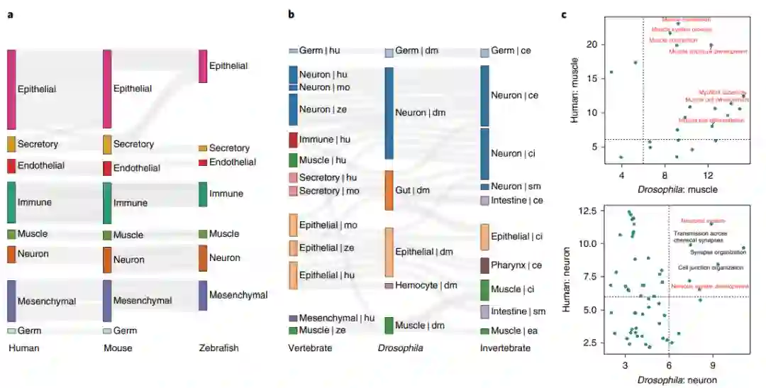 单细胞是生命的基本单位。高通量单细胞RNA测序(scRNA-seq)增强了研究人员识别细胞类型的能力。随着scRNA-seq技术的发展,scRNA-seq分析已被用于绘制各种物种的全生物体细胞图谱,包括人类、斑马鱼、果蝇、小鼠、线虫和涡虫。细胞类型是多细胞生命的基本组成部分,由转录因子(TF)等核心调控因子控制。最近,细胞类型被提出作为具有准独立进化变化潜力的“进化单位”。具有共同谱系祖先的细胞类型共享核心调控TF,其可能在物种进化过程中发生分化。单细胞图谱为系统比较不同物种的细胞类型和调节因子提供了前所未有的机会。