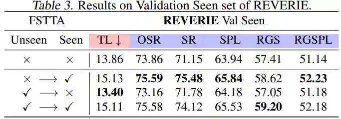 表1:VLN基础模型在REVERIE数据集中采用不同TTA策略的结果