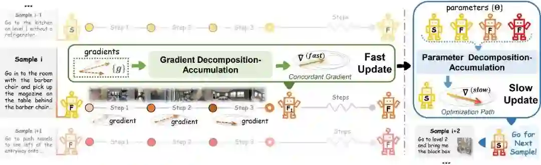 图1:在线视觉语言导航任务示例 为解决上述问题,我们提出了一种面向在线视觉-语言导航任务的快-慢测试时适应(Fast-Slow Test-Time Adaptation, FSTTA)方法。该方法基于统一的梯度-参数分解累积框架,通过结合快速和慢速在线更新两种策略,旨在实现模型适应性和稳定性的平衡。具体而言,在快速更新阶段,我们依据测试时期的训练目标(如熵最小化[6]),在每个动作步骤中来计算优化梯度。然而,由于TTA的无监督特性,这些梯度不可避免地包含噪声信息。若直接使用这些梯度进行更新,可能会损害模型的适应性,特别是在频繁执行更新的情况下。因此,我们构建了一个局部坐标系,通过周期性地分析最近多步导航过程中生成的梯度,以寻找更为可靠的优化方向,确保模型在该阶段能够稳定且有效地适应环境变化。随后,为了进一步缓解过于频繁的模型更新可能导致的累积误差和灾难性遗忘问题,我们引入慢速更新阶段,利用参数变化轨迹分析将模型恢复至一个稳定的状态,以实现更为精准和稳健的模型优化。这两个阶段在测试过程中交替进行,既保证了模型的稳定性,又实现了对动态环境的快速适应。如图1(b)所示,相较于其他更新策略,我们提出的FSTTA方法显著提升了模型性能。 总之,本文的贡献总结如下: * 鉴于跨样本在线指令执行和单样本内多步动作执行的特性,探索了在线视觉语言导航任务,并创新性地提出了一种用于高效导航和模型更新的快-慢测试时适应(FSTTA)方法。 * 提出了一种统一的梯度和参数分解-累积框架,以确保模型在短期快速更新阶段能迅速适应环境变化,同时在长期慢速更新阶段维持模型的稳健性。 * 在四个公开数据集上开展了大量的实验与分析,证明了FSTTA方法能够显著提升现有视觉语言导航模型的性能,且其有效性优于当前的SOTA测试时自适应方法。当应用于代表性的VLN方法DUET时,FSTTA在离散/连续基准数据集上REVERIE/R2R-CE实现了超过5%的性能提升。