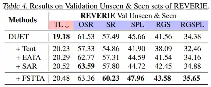 另外,所有表格中的实验结果最佳值均用粗体突出显示。此外,为了更直观地展示我们方法的效果,从表5到表8中,我们使用了不同的字体颜色来指示我们的方法是否超越了相应的基线方法,其中红色表示优于基础模型的结果,蓝色表示表现不如基础模型的结果。 5.1 与其他现有TTA策略的比较 目前,多种TTA策略已被巧妙地集成用于动态模型更新,并取得了显著进展。尽管在视觉语言导航领域对TTA的探索相对较少,但将当前先进的TTA方法整合到VLN中仍然展现出巨大的潜力。鉴于效率是评估TTA方法的重要指标之一,我们提供了每种方法执行单条指令所需的平均时间以供比较。在对比的方法中,SAR[9]和TENT[6]是常见的基于熵最小化的模型,而NOTE[21]、CoTTA[3]、EATA[4]和ViDA[22]则代表最先进的连续TTA(Continual TTA)方法。如表1所示,FSTTA方法在模型性能和测试效率上均展现了出色的能力。具体而言,在Val Unseen数据集上,我们的方法在SR和SPL上分别比现有最先进的SAR方法提升了6.2%和2.5%,同时测试时间减少了7%。