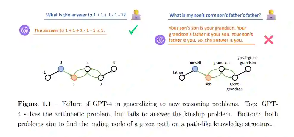 感知和推理是人工智能的两个主要主题。感知赋予代理感知环境并将其处理为知识的能力,而推理则赋予代理利用已存储的知识回答问题和得出新结论的能力。随着深度学习的兴起,在感知领域(如计算机视觉[82]和自然语言处理[210])已经涌现出大量先进的模型。这些模型在从互联网中训练大量数据时达到了巅峰,通常凝聚为一个可以用于广泛任务的单一大型模型[2, 201, 163, 3]——这类模型如今被称为基础模型。然而,在推理领域,深度学习的突破非常有限,因此许多应用仍受制于当前模型的推理能力。造成这种差距的一个根本原因是,推理领域比感知领域需要更复杂的泛化能力。与感知领域中的问题大多是已知问题的插值不同,推理领域中的问题通常是已知问题的外推,例如已知问题的组合、分解、抽象或替换。如果一个模型不具备适当的归纳偏差来处理这种泛化维度,它必然无法解决新的推理问题。图1.1(上)展示了GPT-4[2]的这种失败。GPT-4可以成功地回答一个算术问题,但无法解决一个类似的亲属关系问题,尽管它已经学会了亲属关系的常识。这突显了现有模型架构在执行推理方面的缺陷,即使通过在整个互联网数据上进行训练,这些缺陷也无法弥补。在本论文中,我们旨在推动表示学习模型在推理领域的边界。我们注意到,尽管推理问题在表面形式上各不相同,但它们的核心是代表推理过程中背景知识的结构。因此,回答查询实际上是对这些结构进行一系列操作,通常会产生一个子结构。图1.1(下)展示了上述两个问题的相应结构。从这个角度看,这两个问题具有相同的知识和查询结构,唯一的区别在于与结构相关的词汇。基于这一观察,我们对能够跨越多种结构进行泛化的表示学习模型产生了兴趣,特别是那些在训练时未见过的结构。我们考虑以下几类推理问题中的泛化: