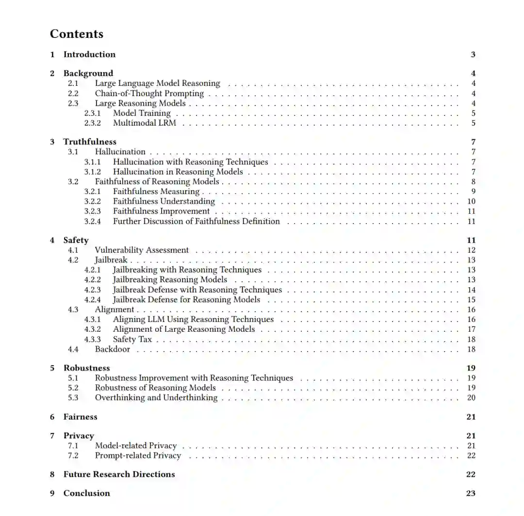 为解答这一问题,我们提出了首个全面综述,以系统回顾可信推理的最新进展。本文的综述围绕五个主要方面展开:真实性、安全性、鲁棒性、公平性和隐私性。在真实性部分,我们聚焦于模型可靠性,涵盖幻觉与推理忠实性,包括利用 CoT 技术的幻觉检测与缓解方法、推理模型中的幻觉分析、推理忠实性度量、忠实性理解,以及提升推理忠实性的方法。在安全性部分,我们旨在理解生成内容的无害性,主要考虑脆弱性评估、越狱、对齐与后门问题。为提高可读性,我们特别区分了针对推理模型的越狱攻击与推理技术在攻击与防御中的应用,并分别成段讨论相关文献。在鲁棒性部分,我们主要关注推理时由对抗性输入噪声引发的错误回答。当语言模型具备推理能力时,“过度思考”(overthinking)与“不足思 考”(underthinking)问题被强调为特殊案例。之后,在公平性部分,我们主要涵盖偏差检测的最新评估与方法。而在隐私部分,我们将相关研究分为模型相关隐私与提示相关隐私,讨论的主题包括模型遗忘、知识产权保护、水印技术以及隐私推断。