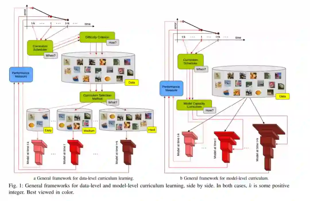 既然神经网络的架构是受到人类大脑的启发,那么我们似乎可以合理地认为,学习过程也应该受到人类学习方式的启发。与机器通常接受的训练方式的一个本质区别是,人类学习基本(简单)概念的时间较早,学习高级(困难)概念的时间较晚。这基本上反映在世界上所有学校系统所教授的课程中,因为当例子不是随机呈现,而是按照有意义的顺序组织起来时,人类学习得更好。使用类似的策略训练机器学习模型,我们可以实现两个重要的好处: (i) 提高训练过程的收敛速度和(ii) 更好的准确性。Elman[16]对这一方向进行了初步研究。据我们所知,Bengio等人[17]是第一个在机器学习的背景下形成易-难训练策略的人,并提出了课程学习(CL)范式。这一开创性的工作激发了许多研究人员在各种应用领域研究课程学习策略,如弱监督对象定位[18],[19],[20],对象检测[21],[22],[23],[24]和神经机器翻译[25],[26],[27],[18]0等。这些研究的实证结果表明,用课程学习取代基于随机小批量抽样的传统训练有明显的好处。尽管课程学习在多个领域都取得了一致的成功,但这种训练策略并没有被主流作品所采用。这一事实促使我们撰写了这篇关于课程学习方法的综述,以提高课程学习方法的普及程度。另一方面,研究人员提出了相反的策略,强调更难的例子,如硬样例挖掘(HEM)[29],[30],[31],[32]或反课程[33],[34],在特定条件下显示出改善的结果。