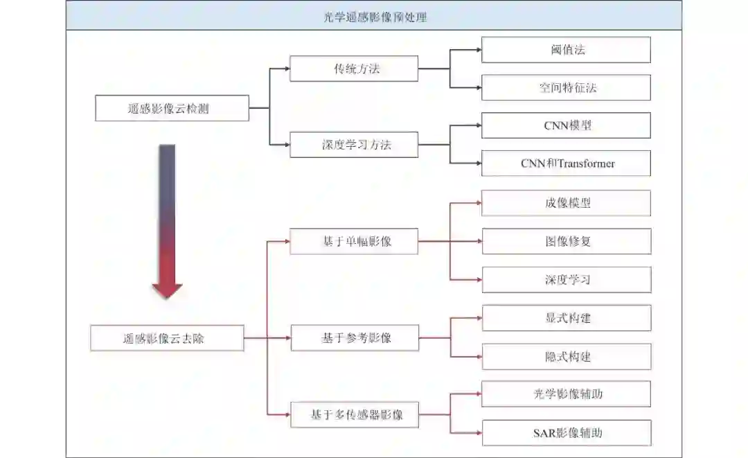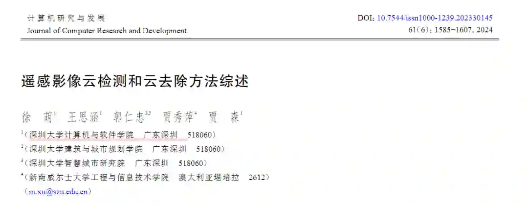 遥感影像是目前可以大范围获取海洋、大气和地球表面信息的数据资源,在农业、军事和城市规划等各个领域发挥重要作用. 但是在影像观测过程中会受到云雾等污染因素的影响,导致遥感影像信息缺失,在实际应用中造成巨大的资源损失和浪费. 因此,如何对遥感影像云雾覆盖区域进行检测并对其进行校正和修复是国内外专家广泛关注的具有挑战性的难点问题. 全面综述其研究进展,总结了现有遥感影像云层检测和去除的挑战;根据是否利用深度学习技术将云检测方法分为2大类,根据是否利用辅助影像将云去除方法分为3大类,依照不同方法特性系统分析和对比了其基本原理和优缺点;基于上述总结在2组遥感影像公开数据集上分别对4种云检测、4种薄云去除和4种厚云去除方法进行了性能评测;最后讨论了本领域目前仍存在的问题,对未来研究方向进行了预测,希望能够对该领域研究人员提供有价值的参考.