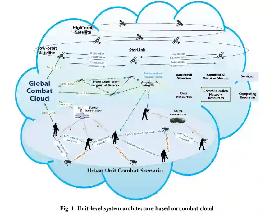 整个架构处于典型的单元级城市作战场景,由地面无人协同单元、各类无人飞行器、机载高低轨卫星组成的星链、全球作战云组成。在单元内部,各作战单元通过自组网、现有5G/6G基站、星链等方式构建单元网络,不同网络链之间优势互补、冗余备份、信息互通,共同构建单元级通信互联网络。