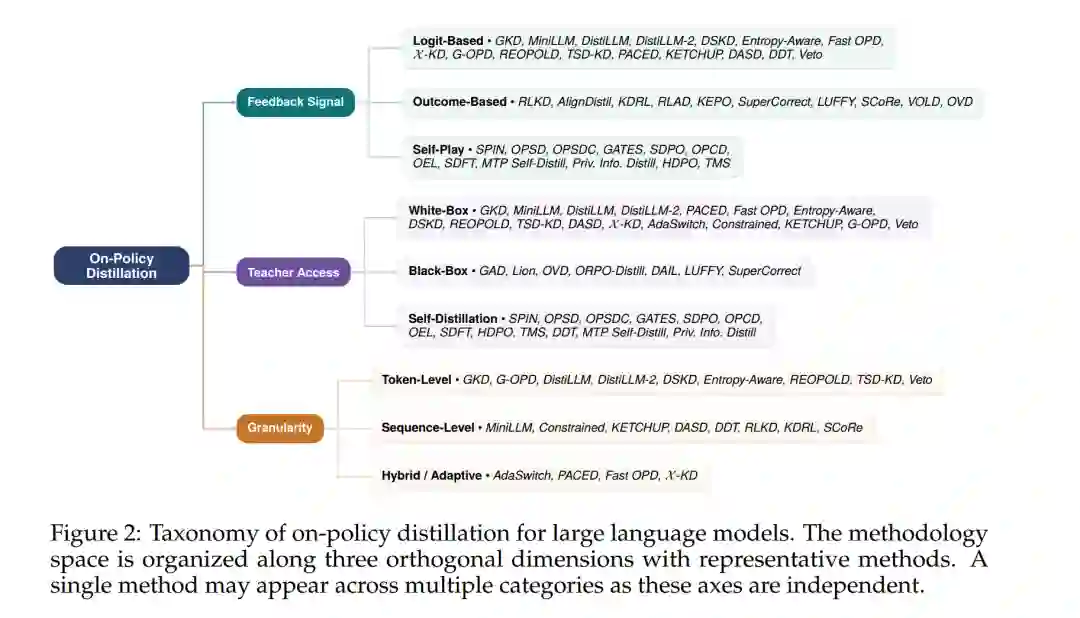 三维分类法:我们沿三个正交轴组织 OPD 方法,即反馈信号(基于 Logit 的分布匹配、基于结果的标量或偏好信号、或自我博弈)、教师访问权限(白盒 Logit 访问、黑盒仅生成访问、或完全无教师的自蒸馏)以及损失粒度(词元级、序列级或混合/自适应级)。该分类法阐明了设计空间,并揭示了代表未来研究方向的、尚未被充分探索的组合。