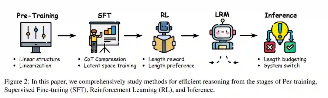 近期多项综述研究了大型推理模型的发展。Besta et al.(2025)和Zeng et al.(2024a)聚焦LRM训练方法,而Li et al.(2025e)提供了更全面的领域概览。为聚焦深层问题,Chen et al.(2025b)研究了长思维链推理并归类现有范式;Ji et al.(2025)则探索了LRM的测试时扩展。然而,现有研究均未专门讨论LRMs推理效率这一关键挑战——它直接影响模型部署、扩展与实际应用。 对于早期LLMs,Zhou et al.(2024)综述了高效推理方法。但LRMs的高效推理是一个新兴且独特的研究挑战,其核心在于冗长且不可控的推理token生成。传统加速推理方法(如模型量化与剪枝(Polino et al., 2018; Xiao et al., 2023a; Xia et al., 2023; Wang et al., 2019; Ma et al., 2023; Cheng et al., 2024)及分布式推理系统(Patel et al., 2024; Hu et al., 2024a; Zhong et al., 2024; Lin et al., 2024a))虽能降低延迟与计算成本,但本文聚焦于推理过程本身的效率优化,而非通用推理加速。 综上,本综述的核心贡献如下: * 区别于泛泛概述LRMs,我们聚焦高效推理这一新兴关键议题,提供深度定向分析。 * 归纳推理低效的常见模式,并阐明大型模型效率优化的独特挑战。 * 系统回顾提升推理效率的最新进展,涵盖从预训练、监督微调、强化学习到推理的端到端LRM开发流程。