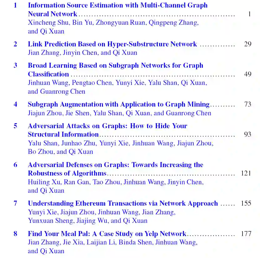 图数据非常强大,因为它能够为对象之间的任意关系建模,并在生物信息学、交通网络、科学协作、万维网和社交网络等领域的一系列现实世界应用中遇到它。图数据挖掘用于从图数据中发现有用的信息和知识。节点、链接和半结构形式的复杂性对节点分类、链接预测、图分类等计算任务提出了挑战。在这种背景下,各种先进的技术,包括图嵌入和图神经网络,最近被提出来提高图数据挖掘的性能。这本书提供了图数据挖掘方法的最先新综述。本文针对当前的一个热门话题——图数据挖掘的安全性,提出了一系列的检测方法来识别图数据中的敌对样本。此外,还向读者介绍了图增广和子图网络,以进一步增强模型,即提高模型的准确性和鲁棒性。最后,本书描述了这些先进技术在各种场景中的应用,如交通网络、社交和技术网络和区块链。