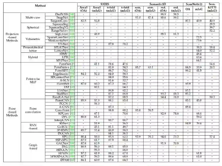 表4:S3DIS(包括Area5和6-fold cross validation)[176]、Semantic3D(包括semantic-8和reduced-8子集)[9]、ScanNet[8]和SemanticKITTI[177]数据集的语义分割结果对比。
