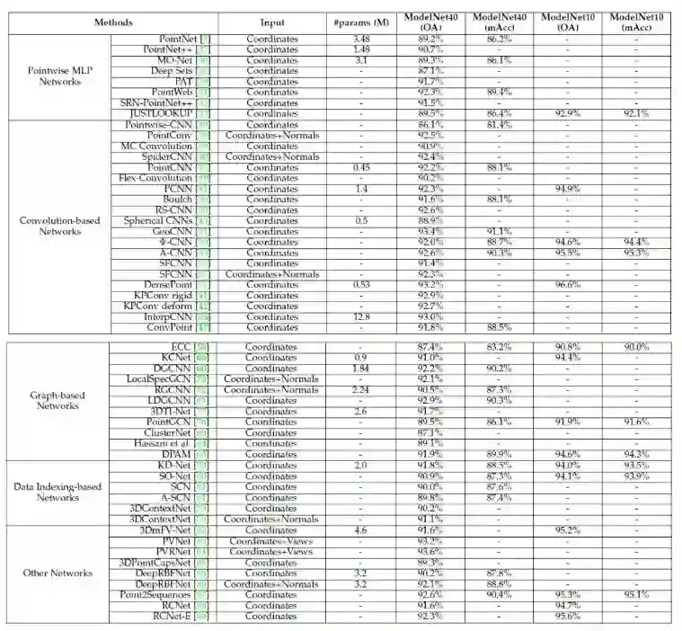 表1:在ModelNet10/40基准上比较三维形状分类结果。这里,我们只关注基于点的网络,“#params”表示相应模型的参数数量。“OA”表示总体精度,“mAcc”表示表中的平均精度。符号“-”表示结果不可用。