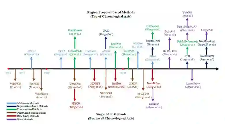 图6:按时间顺序概述的最相关的基于深度学习的三维目标检测方法。