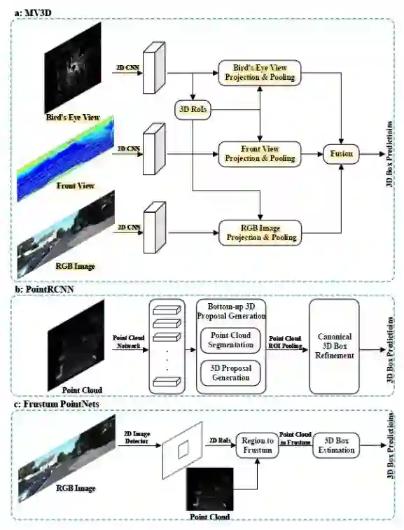 图7:三类三维目标检测方法的典型网络。从上到下:(a)基于多视图,(b)基于分割,(c)基于视锥的方法。