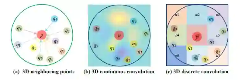 图4:点的局部邻居的连续和离散卷积的图解。(a)代表一个局部邻居;(b)和(c)分别表示三维连续卷积和离散卷积。