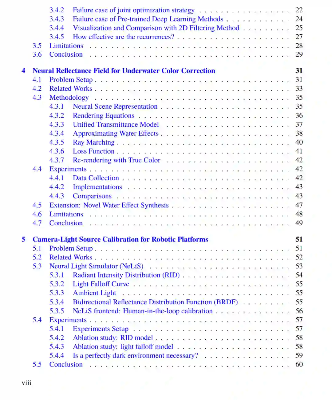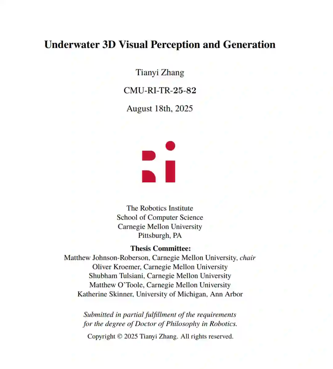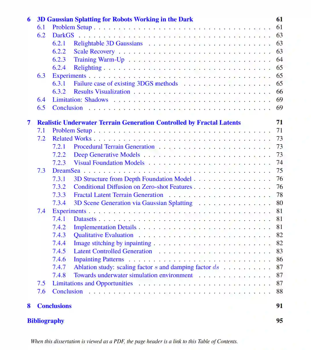 随着现代机器人技术的发展,海底影像对研究人员和公众变得更加易得。本论文利用深度学习和三维视觉技术,从机器人平台采集的海底图像观测中提取有价值的信息。 尽管深度学习和三维视觉算法已在多个领域得到广泛应用,但水下成像面临独特挑战,如缺乏标注、颜色失真和光照不一致等问题,这些因素限制了现成算法的有效性。本论文聚焦于一个核心问题:如何在受到光源和介质干扰严重影响的情况下,从原始水下图像构建三维表征。为实现光真实感的海底三维重建,本文提出并开发了以下算法: (i) 基于循环三维高斯泼溅(recurrent 3D Gaussian Splatting)的无监督水下焦散(caustic)去除方法; (ii) 基于神经反射场(neural reflectance fields)的深水真彩恢复; (iii) 面向机器人平台的相机-光源联合标定方法; (iv) 基于三维高斯泼溅的暗环境重光照方法。 借助机器人收集的大规模海底数据作为训练集,本论文进一步探索了深度生成模型在生成大尺度、具有自然空间变化的水下地形方面的应用。合成的地形可以与所学习的水下光照效应相结合,从而实现逼真的新视角渲染效果。 本文展示了如何将三维计算机视觉与深度生成模型结合物理规律、统计原理以及基础模型,来应对水下机器人感知中的独特挑战。这些研究成果共同奠定了重建高保真水下场景的基础,有助于人类更好地理解海底生态系统,并生成模拟环境,从而缩小水下机器人感知中的“仿真到真实(sim-to-real)”差距。