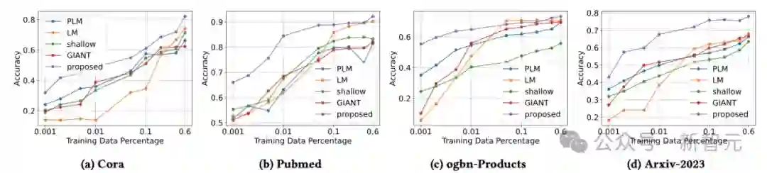 在Cora数据集上,该方法的准确率相比现有方法提高了10.3%,而在PubMed和ogbn-products数据集上,分别提高了2.2%和4%。特别是在arxiv-2023数据集上,由于其内容超出了现有大语言模型的知识截止日期,研究团队的方法依然实现了8.3%的性能提升,进一步证明了该方法在处理新颖和未见数据方面的能力。 研究团队进一步分析了不同训练数据比例下的模型性能,结果显示该方法在训练数据稀缺的情况下仍能保持优异的表现。这表明,通过蒸馏LLM的推理能力到学生模型,该方法能够在有限的数据下有效学习,显示出强大的泛化能力。