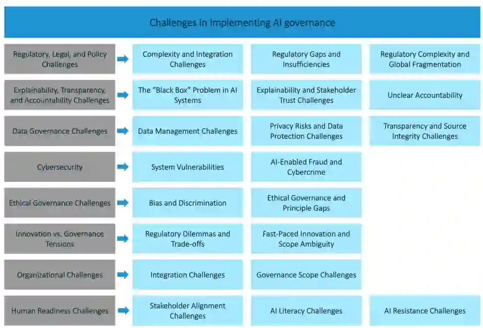 本文提供跨行业的AI治理实施全景式整合:针对监管、技术、组织及伦理四大核心挑战,分别提出针对性解决策略,为从业者提供即用型路线图。通过靶向措施突破已识别的障碍,组织可促进AI技术的可信赖与负责任应用。研究结论为复杂技术环境中推进AI治理奠定基础。