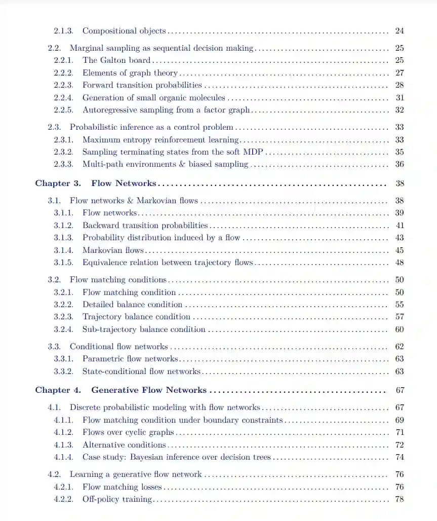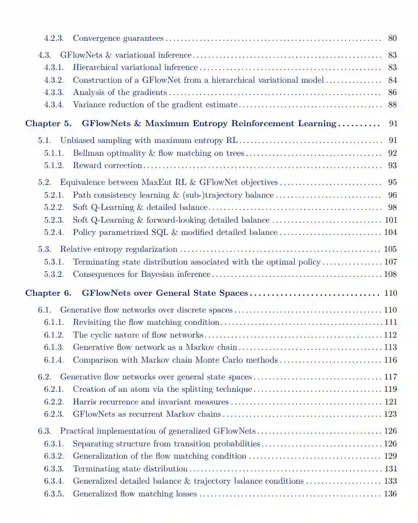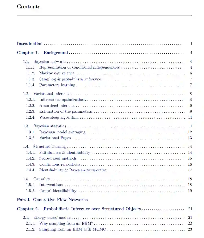 GFlowNet将生成过程视为一个顺序决策问题,通过逐步构建样本来生成数据。这些模型通过在网络中强制执行某些流量的守恒,来描述通过一个归一化常数定义的分布。我们将重点介绍它们如何根植于机器学习和统计学的各个领域,包括变分推断和强化学习,并讨论它们在一般空间中的扩展。 在本论文的第二部分,我们展示了如何利用GFlowNet来近似给定数据的贝叶斯网络的DAG结构的后验分布。
