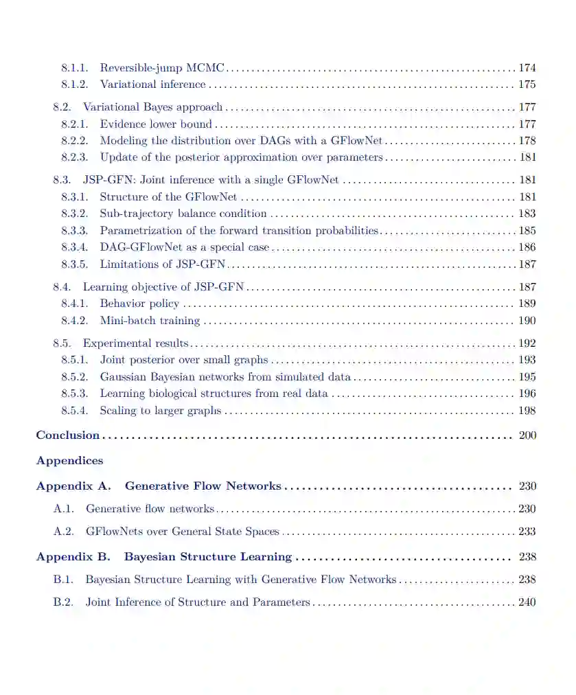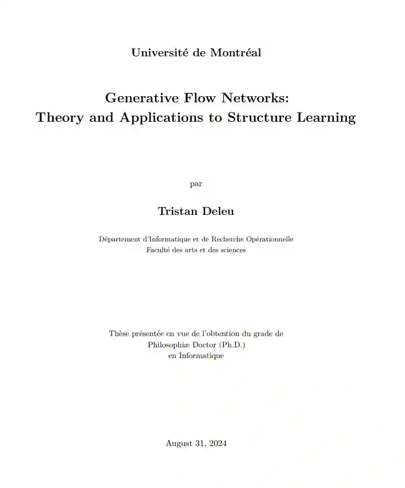 然而,正如贝叶斯推断中的许多问题一样,由于可能的结构数量庞大(这些结构通常表示为有向无环图,DAG),后验分布通常是不可解的。因此,需要进行近似。尽管过去十年中,生成建模领域取得了显著进展,尤其是由变分推断和深度学习强力结合推动的进展,但大多数这些模型都集中于连续空间,使得它们不适用于涉及离散对象(如有向图)的问题,因为这些对象存在高度复杂的无环性约束。 在本论文的第一部分,我们介绍了生成流网络(GFlowNet),一种专门为离散和组合对象(如图)上的分布而设计的新型概率模型。