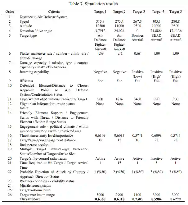 本研究旨在利用一种动态的、基于人工智能的学习模型,实现防空系统中威胁评估与目标分配流程的自动化。与文献中使用不同标准和方法进行的威胁评估研究不同,本研究综合了缺失数据补全、多准则分析和人工神经网络,以动态更新威胁评分。此外,与文献中的研究相比,本研究增加了所使用的准则数量,使模型能够提供更广阔的视角。大多数研究是静态的,且使用少量准则;本研究提出了一个能够处理不完整数据的动态多准则模型。所开发的“综合几何威胁分数”为威胁评估提出了一种平均视角,该视角因个体和地理条件而异。该模型利用从雷达和传感器获取的准则数据生成威胁分数,并能自适应地响应不断变化的条件。所取得的成果显示了高性能,均方误差在0.0005至0.0072之间,相关系数高于95%。该方法加速了防空系统中的决策支持过程,减少了人为影响并提高了系统效能。
