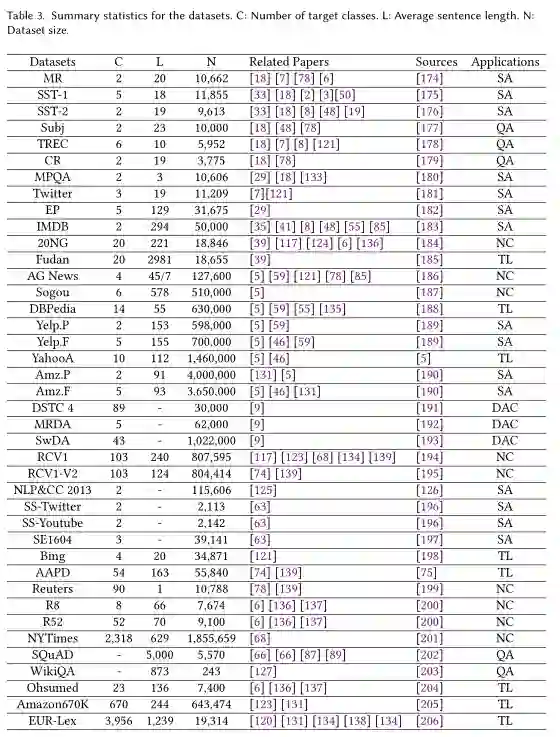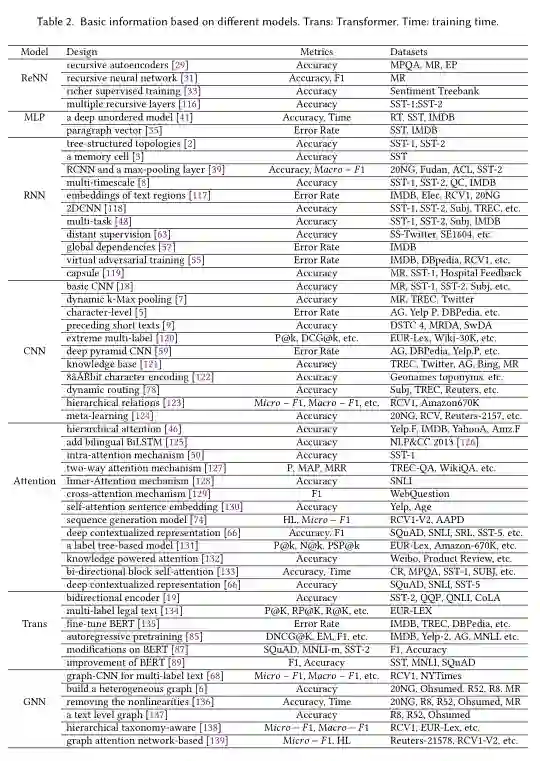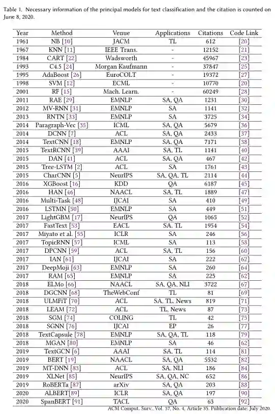 我们在表1中介绍了文本分类的过程和发展,并总结了经典模式在出版年份方面的必要信息,包括地点、应用、引用和代码链接。