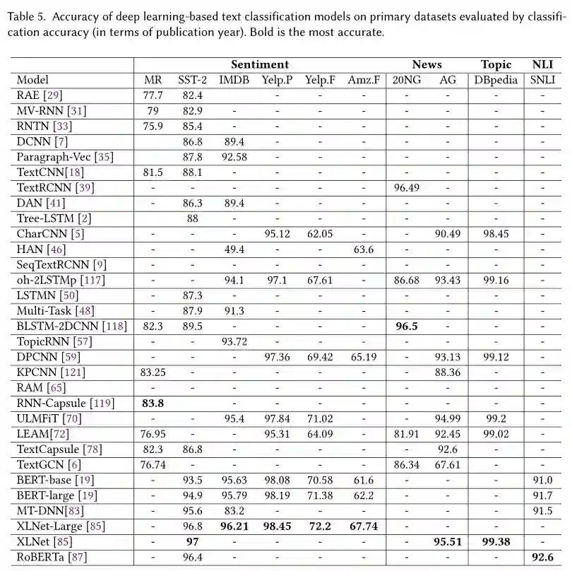 我们在表5中总结了经典模型在基准数据集上的分类精度得分,并通过讨论文本分类面临的主要挑战和本研究的关键意义来总结综述结果。
