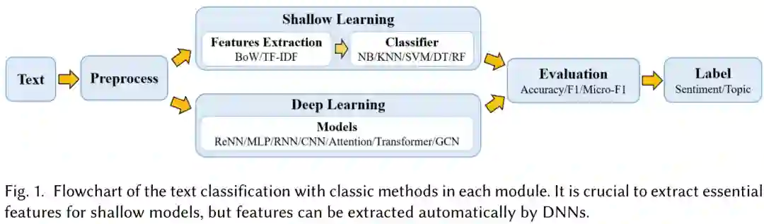 在许多自然语言处理(NLP)应用中,文本分类(为文本指定预定义标签的过程)是一个基本和重要的任务, 如情绪分析[1][2][3],主题标签[4][5][6],问答[7][8][9]和对话行为分类。在信息爆炸的时代,手工对大量文本数据进行处理和分类是一项耗时且具有挑战性的工作。此外,手工文本分类的准确性容易受到人为因素的影响,如疲劳、专业知识等。人们希望使用机器学习方法来自动化文本分类过程,以产生更可靠和较少主观的结果。此外,通过定位所需信息,可以提高信息检索效率,缓解信息超载的问题。 图1给出了在浅层和深层分析的基础上,文本分类所涉及的步骤流程图。文本数据不同于数字、图像或信号数据。它需要NLP技术来仔细处理。第一个重要的步骤是对模型的文本数据进行预处理。浅层学习模型通常需要通过人工方法获得良好的样本特征,然后用经典的机器学习算法对其进行分类。因此,特征提取在很大程度上制约了该方法的有效性。然而,与浅层模型不同,深度学习通过学习一组直接将特征映射到输出的非线性转换,将特征工程集成到模型拟合过程中。