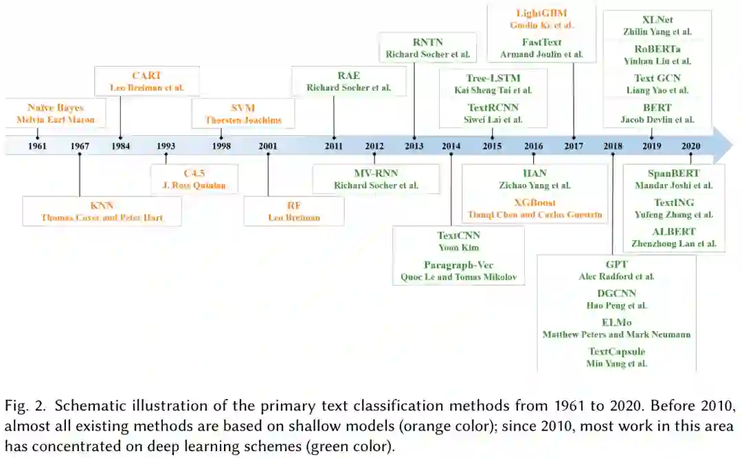 主要文本分类方法的示意图如图2所示。从20世纪60年代到21世纪10年代,基于浅层学习的文本分类模型占据了主导地位。浅层学习意味着在乐此不疲的模型,如 NaÃŕve Bayes(NB)[10], K-近邻(KNN)[11],和支持向量机(SVM)[12]。与早期基于规则的方法相比,该方法在准确性和稳定性方面具有明显的优势。然而,这些方法仍然需要进行特征工程,这是非常耗时和昂贵的。此外,它们往往忽略文本数据中自然的顺序结构或上下文信息,使学习词汇的语义信息变得困难。自2010年代以来,文本分类逐渐从浅层学习模式向深度学习模式转变。与基于浅层学习的方法相比,深度学习方法避免了人工设计规则和特征,并自动提供文本挖掘的语义意义表示。因此,大部分文本分类研究工作都是基于DNNs的,这是一种计算复杂度很高的数据驱动方法。很少有人关注于用浅层学习模型来解决计算和数据的局限性。
