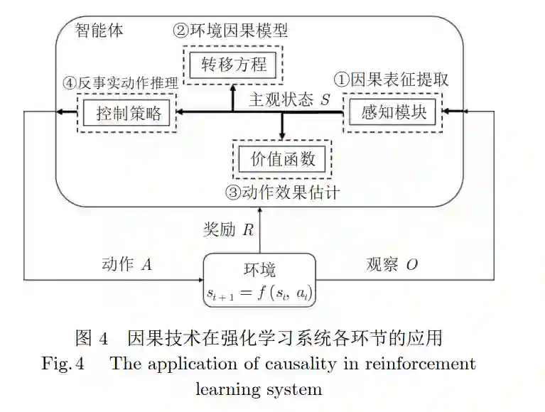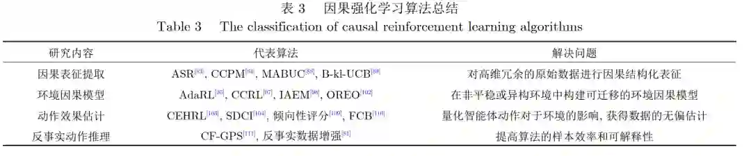 2.3.1 动作效果估计在强化学习的场景下, 动作效果估计的关键问题在于: 1) 量化智能体动作对环境造成的影响, 2) 获得数据的无偏估计, 进而通过干预因果图改变策略分布, 有效地指导策略更新.针对稀疏奖励下的探索和信用分配问题, Corcoll等[103]提出了一种基于受控效果的分层强化学习结构CEHRL (Controlled effects for hierarchical reinforcement learning). CEHRL智能体基于随机效应进行探索, 并依靠反事实推理识别动作对环境的因果影响. 分层式的结构允许高层策略设置跟时间有关的目标, 以此实现长期信用分配, 高效地学习特定任务的行为. Seitzer等[104]引入了基于条件互信息的情境相关因果影响度量SDCI (Situation-dependent causal influence), 用于衡量动作对环境的因果影响, 进而有效地指导学习. 通过将SDCI集成到强化学习算法中, 改进智能体探索能力和离线策略学习性能. 针对强化学习样本效率不高的问题, Pitis等[105]定义了局部因果模型, 并提出了一种用于反事实数据增强的算法, 使用基于注意力的方法在解耦状态空间中发现局部因果结构. 这种局部因果结构可用于提高模型的预测性能, 改善非策略强化学习的样本效率. 为了构建与强化学习智能体相关的有效因果表示, Herlau等[106]以最大化自然间接效应为目标识别因果变量. 识别的因果变量可以集成环境的特征, 从而确保因果表征与智能体相关.此外, 虽然动作效果估计可以量化干预和结果之间的影响, 但是采集的观测数据受现有的策略影响, 可能会间接造成选择偏倚问题. 为了实现数据的无偏估计, 研究人员常常采用重要性采样加权[107]进行离线策略评估, 但是该方法具有高方差和高度依赖权重的缺陷. 为了从观测数据中选择最佳策略, Atan等[108]考虑了观测数据评估新策略时的产生的估计误差, 提供了估计误差的理论界限, 并提出了一种使用域对抗神经网络选择最优策略的方法, 结果表明估计误差取决于观测数据和随机数据之间的H散度. 在批量学习的场景下, Swaminathan等[109]指出仅对离策略系统的性能进行无偏估计不足以实现稳健学习, 还需要在假设空间中推断估计量的方差有何不同. 该项研究通过倾向性评分设计了反事实估计器, 提出了反事实风险最小化原则, 证明了倾向加权经验风险估计计量方差的广义误差界限. 为了学习结构化输出预测的随机线性规则, 提出了指数模型策略优化器, 从而实现有效的随机梯度优化. 为了消除由旧策略和新策略引起的分布偏倚, 精确评估新策略的效果, Zou等[110]提出了重点上下文平衡算法FCB (Focused context balancing), 用于学习上下文平衡的样本权重.2.3.2 反事实动作推理利用因果框架, 智能体可以进一步回答与强化学习控制任务相关的反事实问题. 例如在已有观测数据的前提下, “如果策略中的某些动作发生变化, 系统的控制性能能否提升”? 目前, 反事实动作推理已经被证明可以提高强化学习算法的样本效率和可解释性[81,111]. Madumal等[112]提出了一种基于结构因果模型的行为影响模型, 利用因果模型进行反事实分析, 提高了模型的可解释性. 在非平稳数据的场景下, Lu等[81]提出了一种基于反事实的数据增强算法. 该算法利用结构因果模型对环境动态进行建模, 并基于多领域数据的的共性和差异进行因果模型估计. 智能体可以根据结构因果模型进行反事实推理, 解决了有限经验导致策略偏倚的问题, 避免风险性探索. 同时利用反事实推理进行数据集扩充, 提高了数据利用率. 在POMDP的框架下, Buesing等[111]提出了反事实指导的策略搜索算法CF-GPS (Counterfactually-guided policy search), 基于结构因果模型对任意策略进行反事实评估, 改善策略性能, 消除模型预测的偏差.