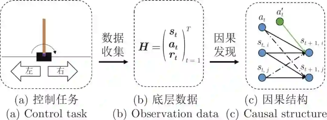 在本节中, 我们将详细阐述如何利用因果关系改善强化学习控制与决策. 强化学习的目标是最大化期望累积奖励, 智能体本身不具备因果推理的能力. 如1.3节所述, 现有的强化学习算法存在两类缺陷. 幸运的是, 这两类缺陷恰好可以通过引入因果关系来解决. 与一般的强化学习控制不同, 因果强化学习可以区分系统变量之间的虚假相关性和因果关系. 接下来以倒立摆系统为例, 说明如何将因果分析融入强化学习系统, 辨别虚假相关性. 倒立摆系统是强化学习领域的基准测试环境. 智能体对小车施加动作a, 令其沿着无摩擦水平轨道左右移动, 控制目标是防止车上的杆跌落. 因此在杆保持直立的每个时刻, 智能体获得奖励rt=+1,. 状态变量s分别为小车位置、小车速度、杆与车之间的角度和角速度. 因果强化学习的处理流程如下: 首先从控制任务 (如图3(a)所示) 中采样观测数据, 具体包括状态变量、动作变量和奖励变量 (如图3(b)所示); 然后利用因果理论, 从观测数据中提取高层的因果特征, 并将其形式化表示成一个能够反映数据生成过程的因果结构 (如图3(c)所示). 通过这种方式直观地展示虚假关系 (虚线) 和因果关系 (实线), 降低冗余信息的影响, 提高数据利用率. 此外, 强化学习数据采集过程中常常存在选择偏倚问题. 在控制系统中引入因果分析有助于理解偏倚, 并利用do算子实现对干预效果的形式化推理. 例如, 在图3(c)中对动作at进行干预do(A=a′t)(如绿线所示) 只会影响因果图中的子代变量st+1,i 而对其他非因果变量st+1,j不产生影响, 从而可以进行有针对的干预.