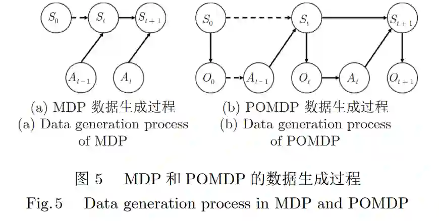 2.2.1 因果表征提取在强化学习控制系统中, 系统的输入状态可能是高维或非结构化数据. 因此引入恰当的结构化表征可以对冗余的原始数据进行信息提取, 有助于解决强化学习的可解释性问题. 总的来说, 和强化学习控制相关的因果表征提取主要分为基于POMDP的表征提取和存在混杂因子的表征提取.基于POMDP的表征提取通常假设观测数据O(通常是高维或非结构化数据, 如像素输入) 由潜在状态S 生成, 智能体根据策略π(A|O)采取行动, 通过与环境交互获得观测数据, 并基于观测数据恢复潜在状态. 与显式的MDP不同 (如图5(a)所示), 基于POMDP的表征提取 (如图5(b)所示) 的关键问题在于如何找到O→S的映射, 并根据过去的动作A≤t 和过去的潜在状态S≤t预测未来的潜在状态S>t, 学习底层因果图结构. Yao和Sun等[82]指出潜在时序因果状态在一定场景下是可识别的, 该研究为基于POMDP的表征提取提供了理论保证. 该类方法的代表性工作包括动作充分状态表示ASR (Action-sufficient state representation)[83]和因果正确部分模型CCPM (Causally correct partial models)[84]. ASR以最大化累积奖励为目标, 基于变量结构关系建立环境生成模型, 以因果结构为约束提取出足够决策的最小状态表示集. 在ASR的框架下, 策略学习与表征学习可以分开进行, 且策略函数只依赖于低维状态表征, 从而提高了样本利用率, 缺点是没有扩展到可迁移的场景下. 为了在策略发生变化的情况下对模型进行修正, 解决部分模型中因果不正确的问题, CCPM结合概率模型和因果推理, 提出了因果正确的部分可观模型, 提高了模型的鲁棒性. 此外, 部分研究人员致力于将因果技术和POMDP融入一个框架内进行分析. Sontakke等[85]引入了因果好奇心 (Causal curiosity) 作为内在奖励, 鼓励智能体在探索性交互时, 通过自监督的方式发现环境中变化的因果机制. Gasse等[86]通过引入do算子, 将有模型的强化学习表示为因果推理问题, 并且使用观测数据和干预数据共同推断POMDP的状态转移方程. 由于假设观测空间要小于离散状态空间, 因此该方法的缺点是只能处理维数较低的观测空间. 为了解决高维观测空间问题, Zhang等[87]利用循环神经网络从观测数据中学习近似的因果状态表示, 并在Lipschitz假设下为该表示连续版本的最优性提供了理论保证.