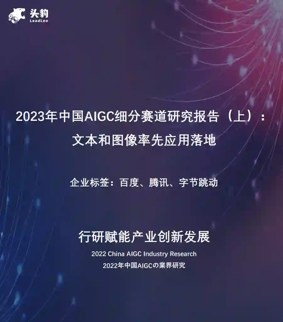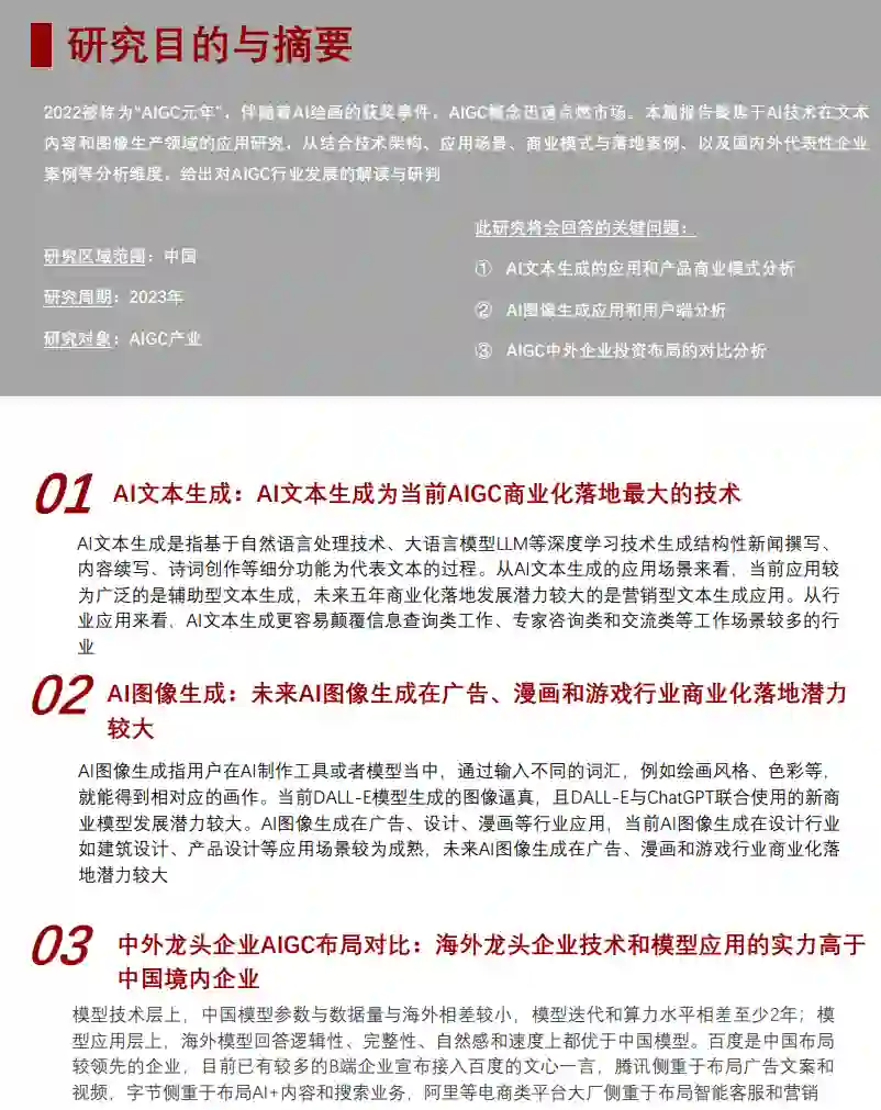 AI文本生成是指基于自然语言处理技术、大语言模型LLM等深度学习技术生成结构性新闻撰写、内容续写、诗词创作等细分功能为代表文本的过程。从AI文本生成的应用场景来看,当前应用较为广泛的是辅助型文本生成,未来五年商业化落地发展潜力较大的是营销型文本生成应用。从行业应用来看,AI文本生成更容易颠覆信息查询类工作、专家咨询类和交流类等工作场景较多的行业 AI图像生成:未来AI图像生成在广告、漫画和游戏行业商业化落地潜力较大 AI图像生成指用户在AI制作工具或者模型当中,通过输入不同的词汇,例如绘画风格、色彩等,就能得到相对应的画作。当前DALL-E模型生成的图像逼真,且DALL-E与ChatGPT联合使用的新商业模型发展潜力较大。AI图像生成在广告、设计、漫画等行业应用,当前AI图像生成在设计行业如建筑设计、产品设计等应用场景较为成熟,未来AI图像生成在广告、漫画和游戏行业商业化落地潜力较大 中外龙头企业AIGC布局对比:海外龙头企业技术和模型应用的实力高于中国境内企业 模型技术层上,中国模型参数与数据量与海外相差较小,模型迭代和算力水平相差至少2年;模型应用层上,海外模型回答逻辑性、完整性、自然感和速度上都优于中国模型。百度是中国布局较领先的企业,目前已有较多的B端企业宣布接入百度的文心一言,腾讯侧重于布局广告文案和视频,字节侧重于布局AI+内容和搜索业务,阿里等电商类平台大厂侧重于布局智能客服和营销
