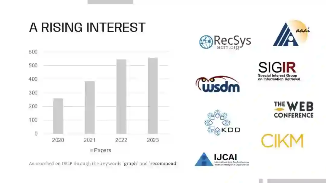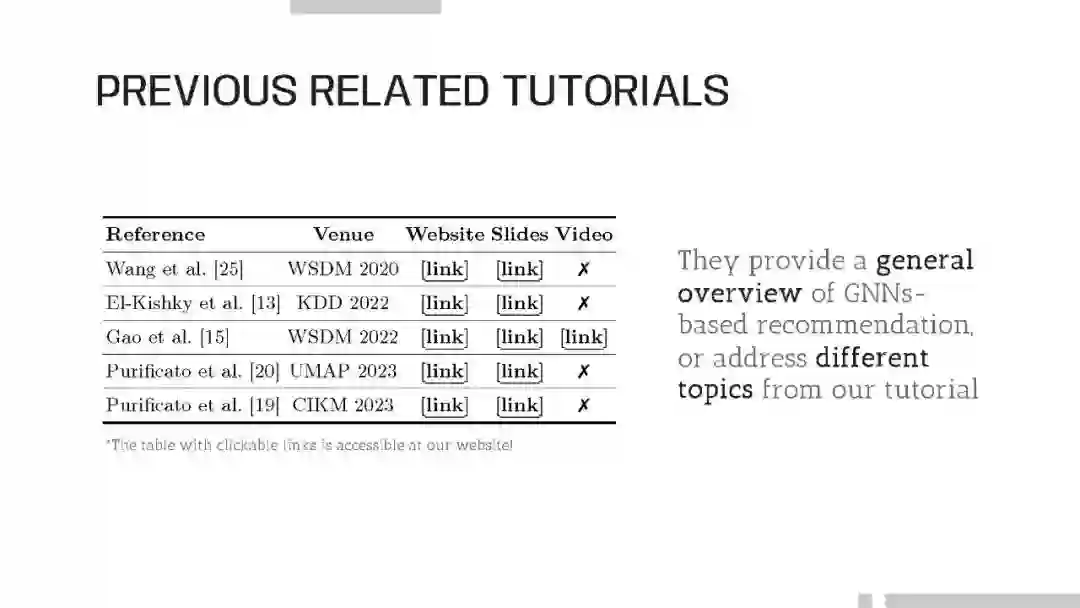 图神经网络(GNNs)近年来在推荐系统中获得了显著的关注。通过将用户-项目矩阵表示为二部和无向图,GNNs展现出捕捉用户-项目之间短距离和长距离交互的潜力,从而学习比传统推荐方法更准确的偏好模式。与之前同主题的教程相比,本教程旨在展示和检验三个关键方面,这些方面特征化了推荐系统中的GNNs:(i) 最新方法的可重复性,(ii) 图拓扑特征对这些模型性能的潜在影响,以及(iii) 在从头开始训练特征或利用预训练嵌入作为额外项目信息(例如,多模态特征)时学习节点表示的策略。目标是为该领域提供三个新颖的理论和实践视角,这些视角目前在图学习中受到争议,但在推荐系统的背景下长期被忽视。