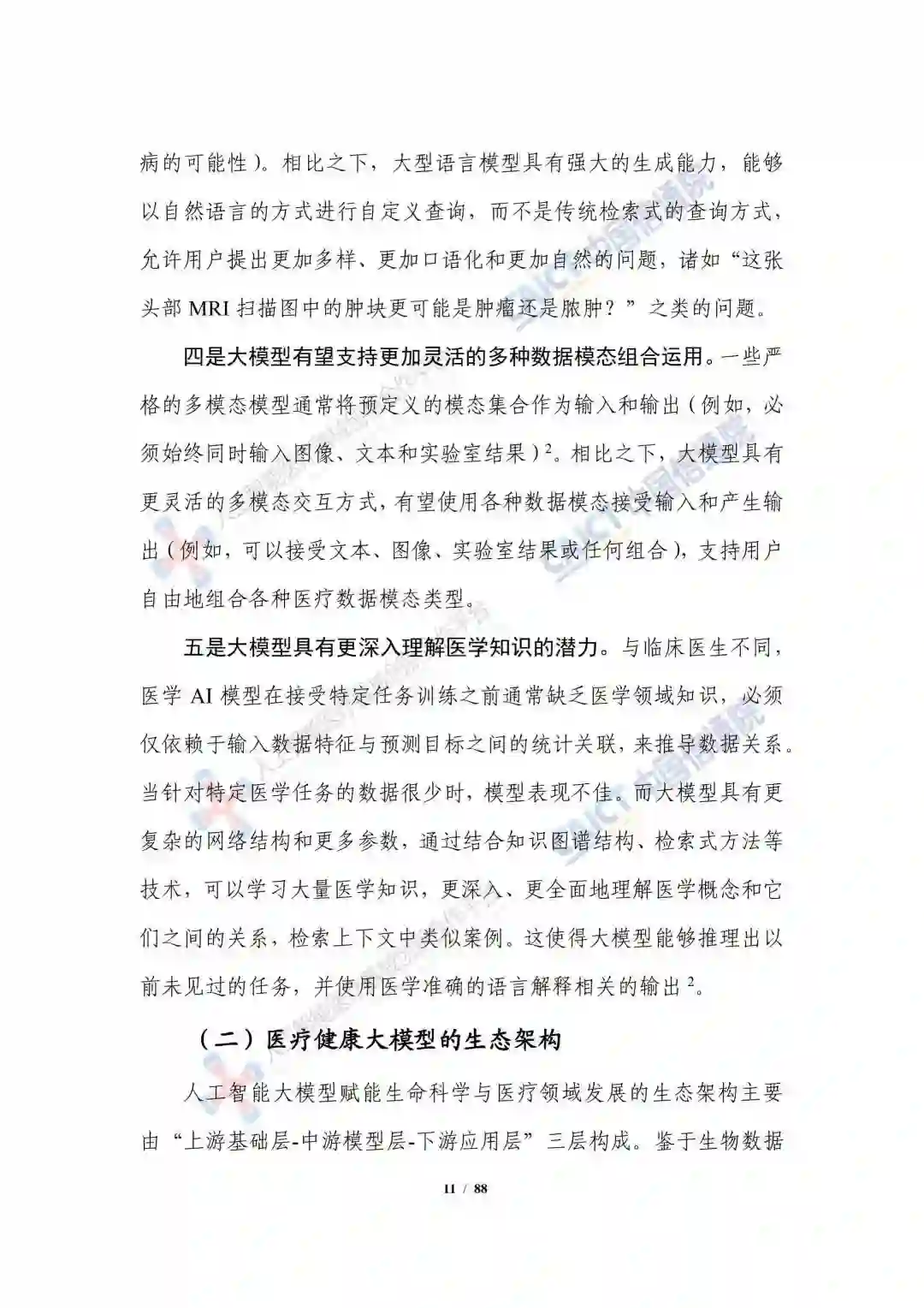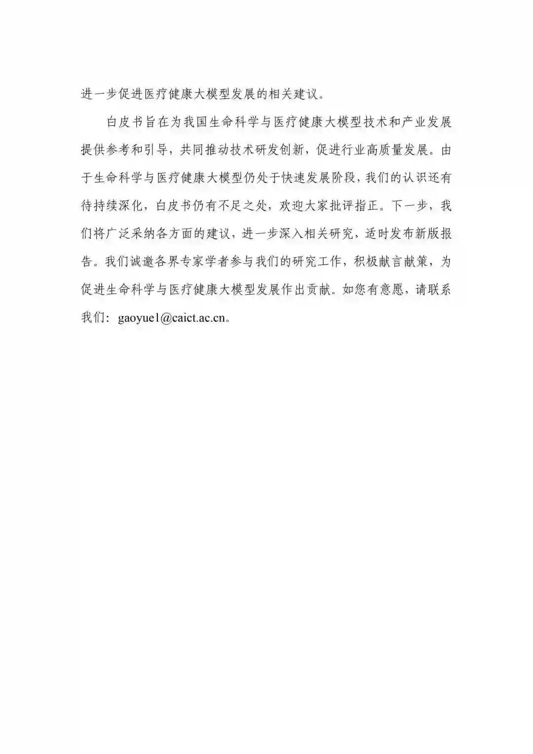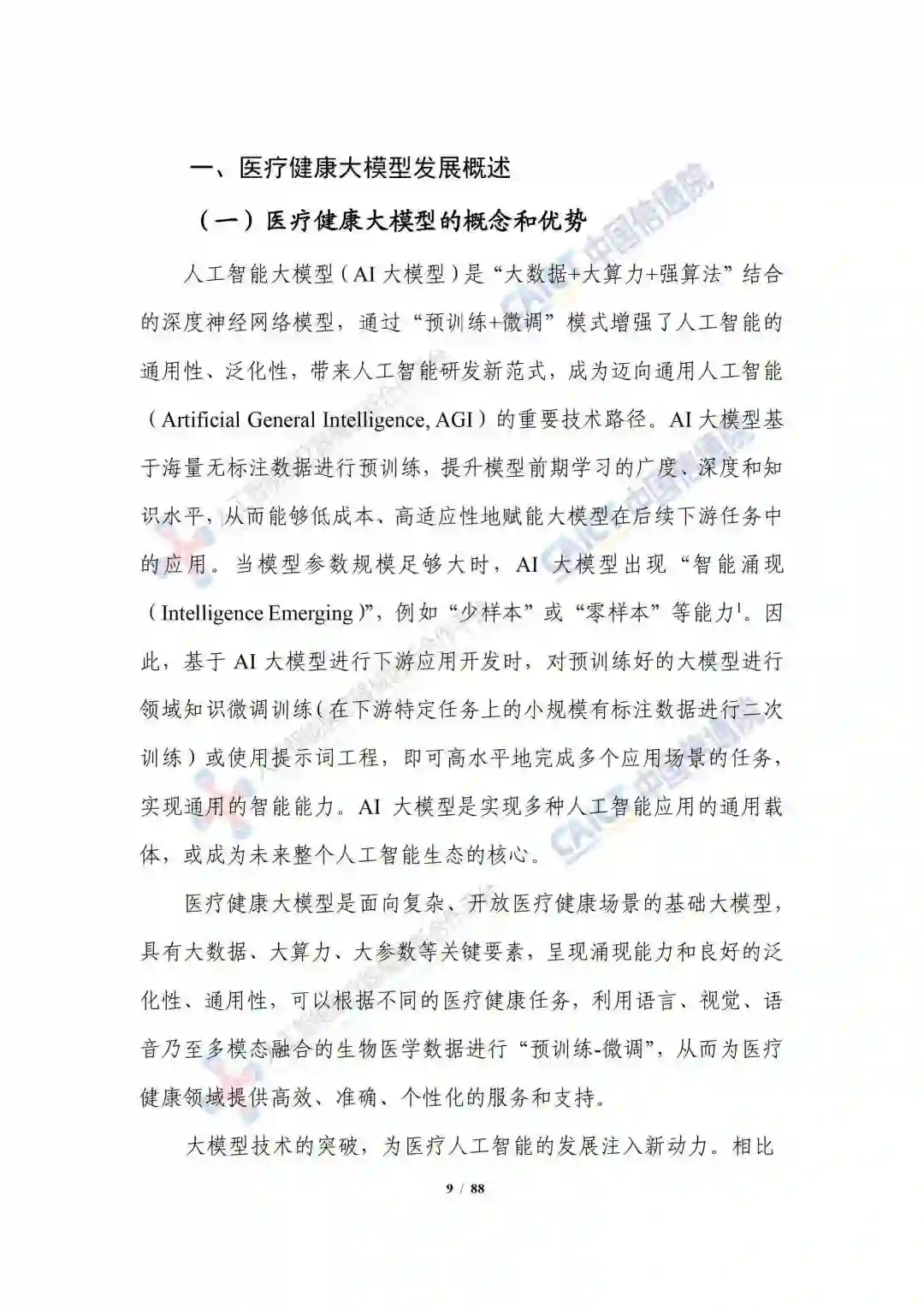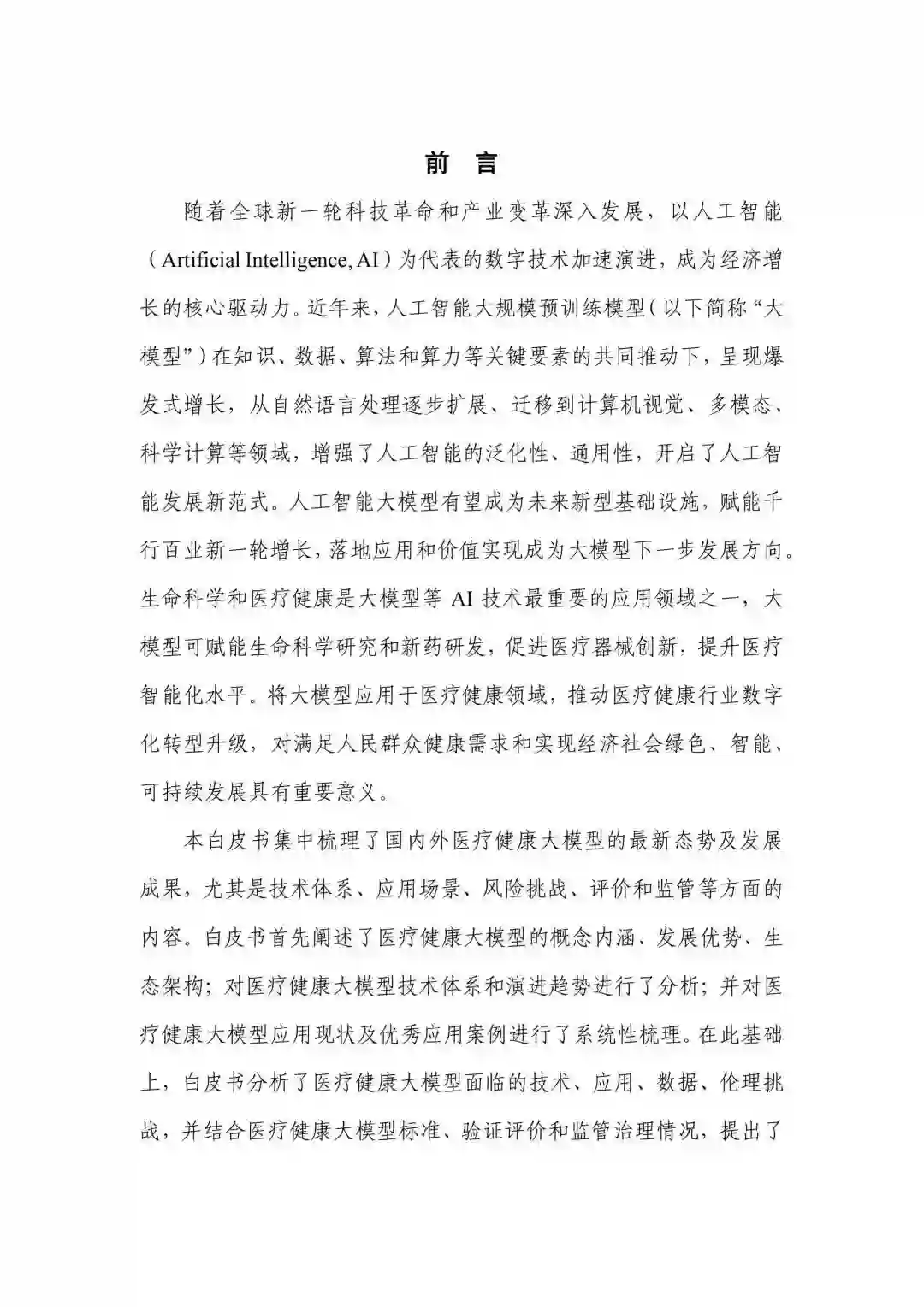 白皮书首先阐述了医疗健康大模型的概念内涵、发展优势、生态架构;对医疗健康大模型技术体系和演进趋势进行了分析;并对医疗健康大模型应用现状及应用场景(一级场景和二级场景)进行了系统性梳理。在此基础上,白皮书分析了医疗健康大模型面临的技术、应用、数据、伦理挑战,并结合医疗健康大模型标准指南、评价验证和监管治理情况,提出了进一步促进我国医疗健康大模型发展的建议。