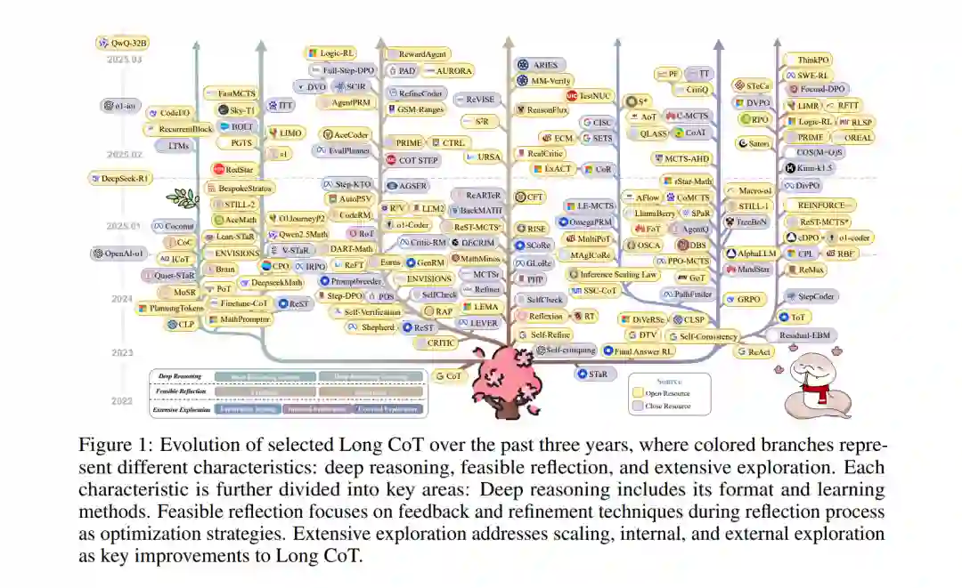 近年来,大型语言模型(RLLMs)在推理领域取得了显著进展,例如OpenAI-O1和DeepSeek-R1,它们在数学和编程等复杂领域中展现了令人印象深刻的能力。其成功的一个核心因素在于长链推理(Long CoT)特性的应用,这种特性增强了模型的推理能力,使其能够解决复杂问题。然而,尽管取得了这些进展,目前仍缺乏对长链推理的全面综述,这限制了我们对其与传统短链推理(Short CoT)区别的理解,也使关于“过度思考”和“测试时间扩展”等问题的讨论更加复杂。本综述旨在填补这一空白,为长链推理提供一个统一的视角。 1. 区分长链推理与短链推理:我们首先明确长链推理与短链推理的区别,并引入一种新的分类法来对当前的推理范式进行分类。 1. 长链推理的核心特性:我们探讨长链推理的三大关键特性——深度推理、广泛探索和可行反思。这些特性使模型能够处理更复杂的任务,并生成比浅层短链推理更高效、更连贯的结果。 1. 关键现象研究:我们研究了长链推理中的关键现象,例如伴随这些特性出现的“过度思考”和“测试时间扩展”,并深入分析这些现象在实际中的表现。 1. 未来研究方向:最后,我们指出了当前研究中的重要空白,并强调了未来的潜在方向,包括多模态推理的整合、效率提升以及知识框架的优化。通过提供结构化的综述,本文旨在启发未来的研究,并推动人工智能逻辑推理的进一步发展。