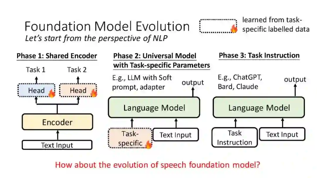 语音基础模型的进展历程近几个月来,关于文本基础模型能力的讨论激增,特别是大型语言模型(LLM)。LLM以其通用处理能力而闻名,可以使用适当的指令有效地执行各种任务。与文本不同,语音包含丰富的、分层的信息,需要不同的功能来满足不同的应用。这就提出了一个问题:我们距离开发能够理解和执行任务指令的语音基础模型还有多远?本报告深入探讨了语音处理中基础模型的演变,强调了三个重要阶段:具有特定任务头的共享编码器、具有自适应参数的通用模型和任务指令模型。首先介绍了语音处理通用性能基准(SUPERB),该基准评估了跨多个任务的共享编码器。然后,讨论转移到探索语音语言模型中提示的使用。本报告最后着重介绍Dynamic SUPERB,这是一个旨在评估语音处理任务教学模型的项目。