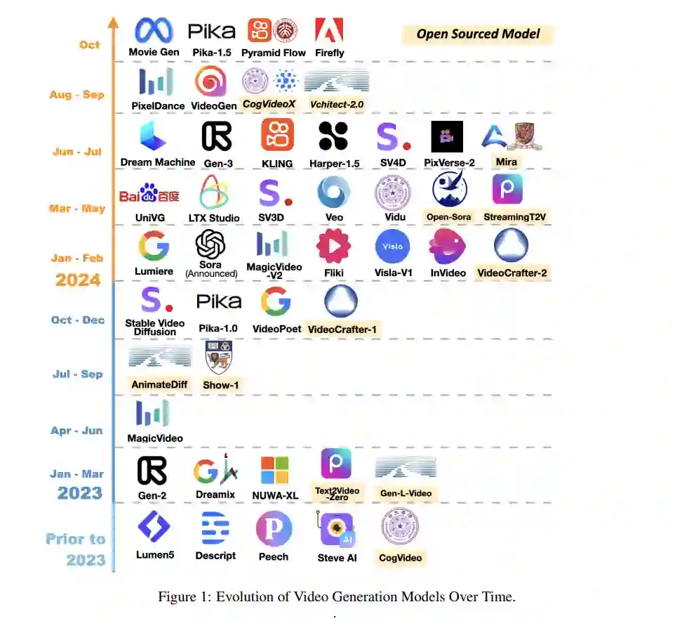 上述基础技术的进展大大提升了最近视频生成模型的性能。这些模型在开源和商业领域都实现了快速增长,在生成内容的保真度和时长方面不断提升,如图2上半部分所示。