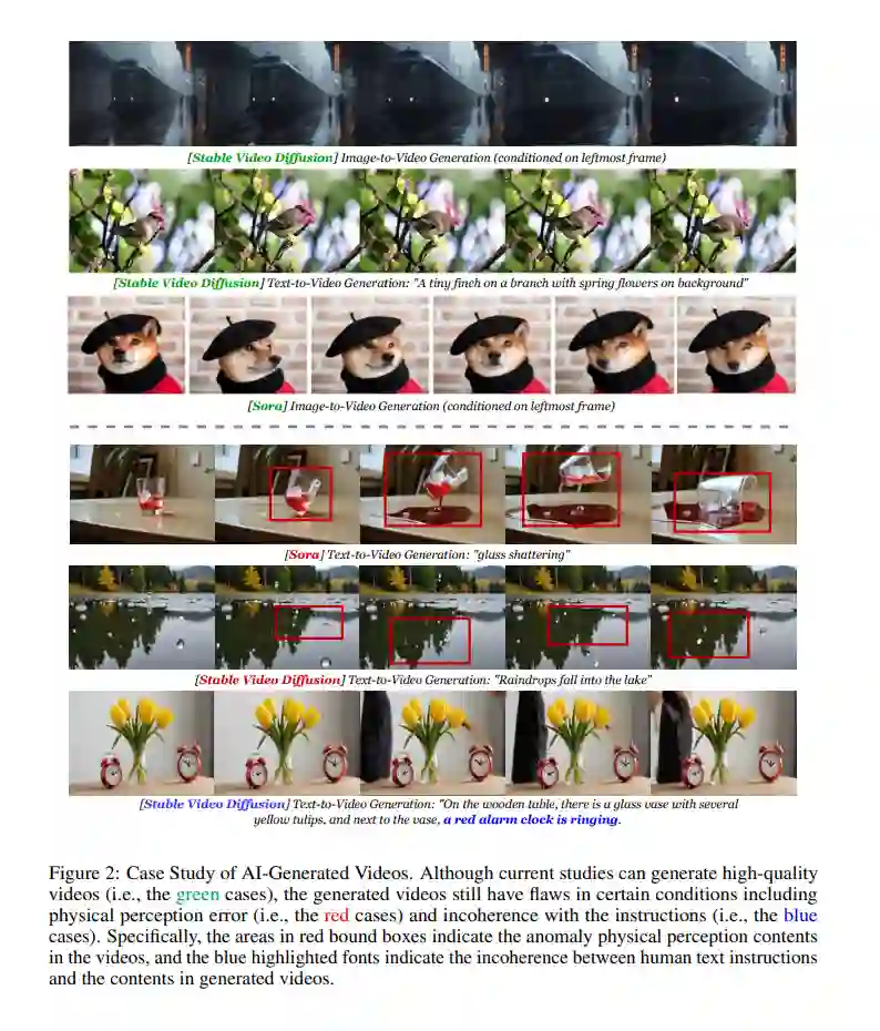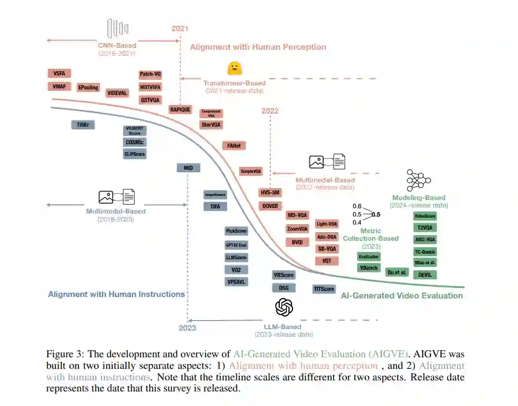 通过广泛审查和分类现有研究 [159, 266, 141, 139],我们建议AI生成的视频应满足两个主要标准:1)与人类感知的对齐;2)与人类指令的对齐。