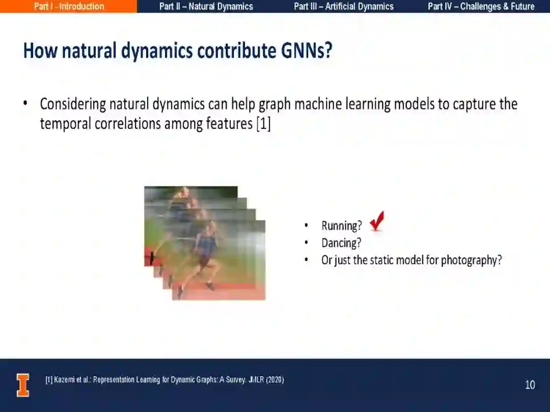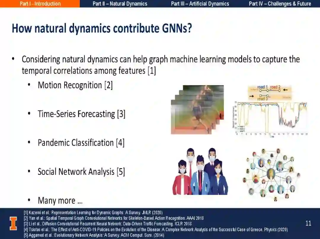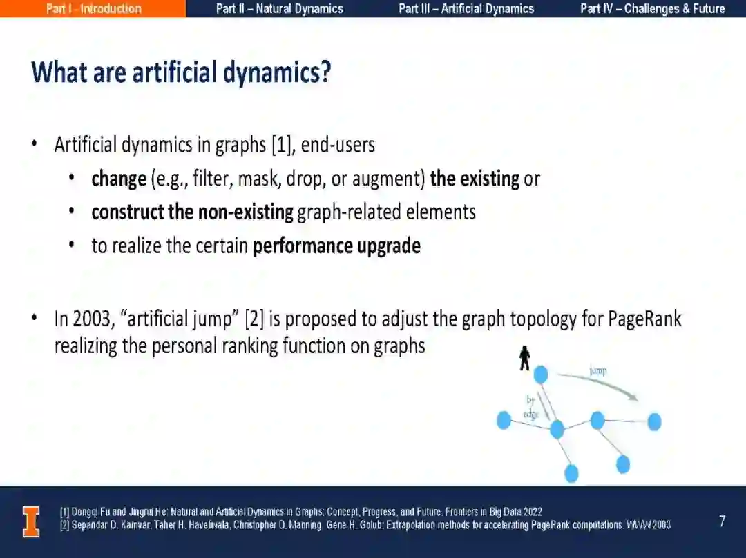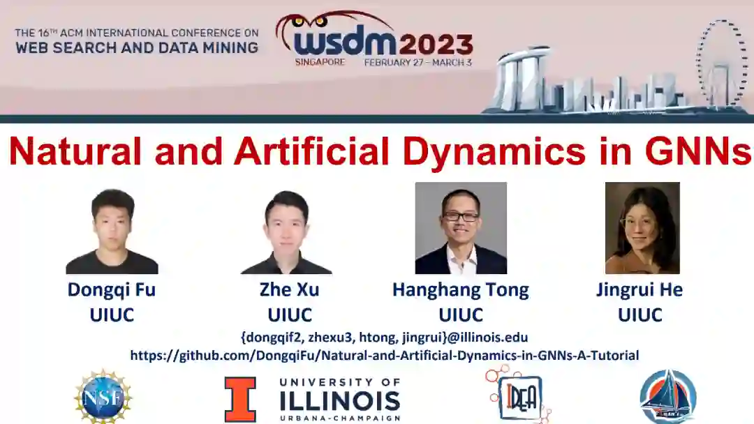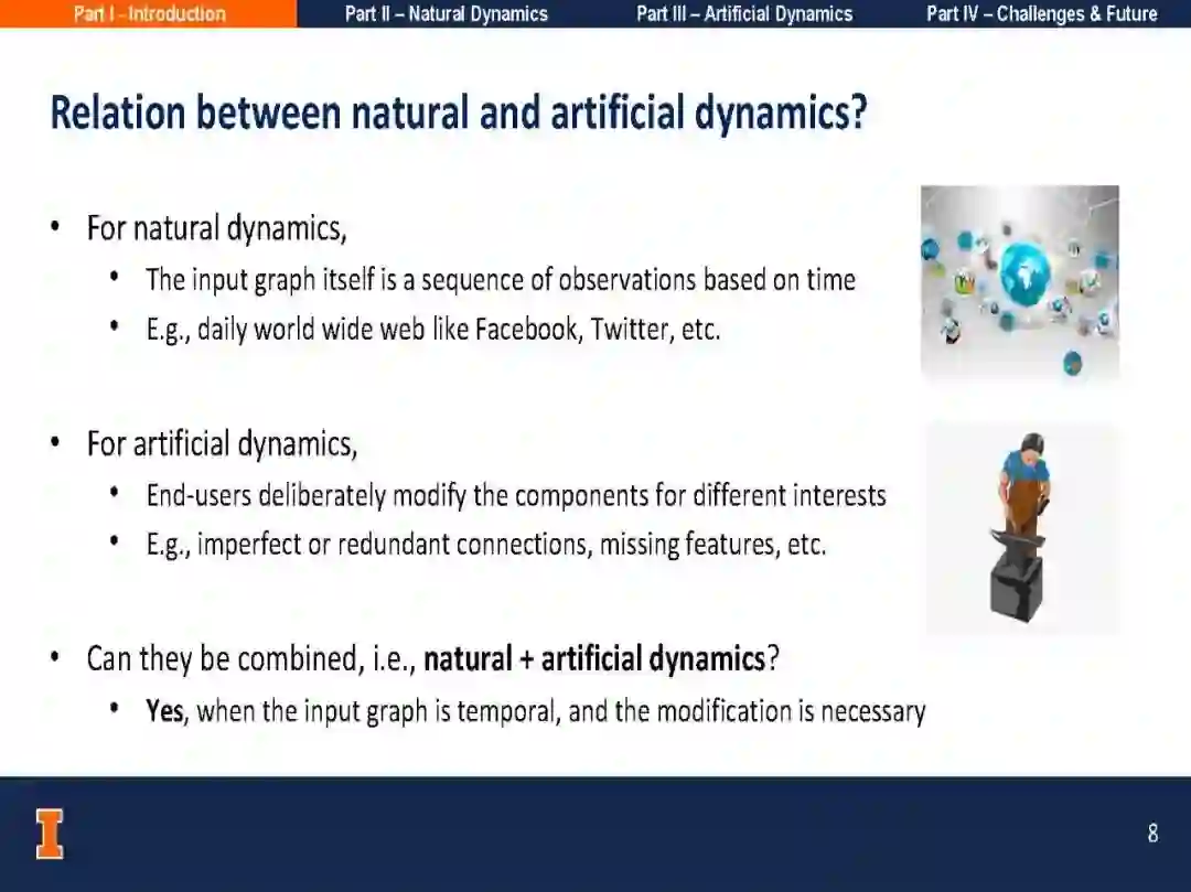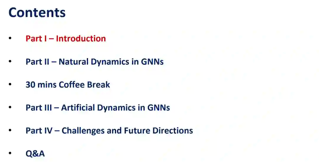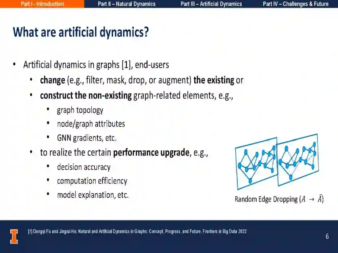 在大数据时代,实体之间的关系变得更加复杂。因此,图(或网络)数据因承载复杂关系信息而受到越来越多的研究关注。对于无数的图挖掘/学习任务,图神经网络(GNNs)已被证明是提取信息节点和图表示的有效工具,它赋予了广泛的应用,如推荐,欺诈检测,分子设计等。然而,现实世界给GNN带来了实际挑战。首先,输入图是不断演化的,即图结构和节点特征是时间依赖的;将时间信息集成到GNN中以增强其表示能力需要额外的巧妙设计。其次,输入图可能是不可靠的、有噪声的,并且对于各种下游图挖掘/学习任务来说是次优的。最终用户如何故意修改给定的图(例如,图拓扑和节点特征)以提高GNN的效用(例如,准确性和鲁棒性)? 受上述两种动力学的启发,本教程重点介绍GNN中的自然动力学和人工动力学的主题,并系统地介绍相关工作。在此基础上,指出了在这两种动态结合方面一些有前途但尚未探索的研究问题。我们希望本教程可以对数据挖掘、机器学习和通用人工智能等领域的研究人员和从业人员有所帮助。