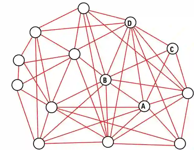 图5展示了此过程的简化说明。设想节点A代表一个陆军步兵排,它需要发送信息给节点D——同属一个自适应兵力编组的一部分的机械化单位。由于这些单位在密集的城市环境中行动,节点A与D之间的通信路径被数座建筑物阻挡,然而,节点A与节点B(一个小型无人机系统)之间存在一条清晰的路径,节点B与节点D之间也有。在这种情况下,网络将自动识别出从节点A向节点D发送信息的最佳途径是通过节点B,并据此通过此路径完成信息传输。按照此逻辑,随着更多节点以分散方式加入,网络变得越有效和可靠。